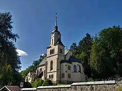 Die oberhalb der Flöha am Hang gelegene Kirche bildet mit den oberhalb der Flöha gelegenen Baumwollspinnereien im Tal eine malerische Baugruppe. Die Saalkirche im Stil der deutschen Renaissance mit Verwendung von Jugendstilelementen wurde nach einer Stiftung des Fabrikanten Max Eugen Hauschild nach Plänen des Architekturbüros Schilling & Graebner im Jahr 1896 erbaut. Das additiv und asymmetrisch auf eine malerische Wirkung hin konzipierte Bauwerk ist vergleichbar mit der Kirche Stenn im Landkreis Zwickau, Restaurierungen wurden in den Jahren 1980 und seit 1997 durchgeführt.