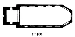 Es handelt sich um einen Saalbau mit dreiseitigem Schluss im Stil der Renaissance. Im Inneren stützen Wandpfeiler mit Blendbögen eine Holzdecke. Die Fenster sind zweiteilig mit geradem Sturz.[2]