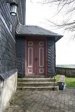 Der nicht geostete, sondern nach Nordost ausgerichtete Saalbau aus verschiefertem Fachwerk ist im Norden des alten Ortskerns weithin sichtbar erhöht errichtet.[1] Die Kirche ist auf der äußeren ringförmigen Burgmauer südöstlich des Schlosses unterhalb der Burg erbaut.[1]