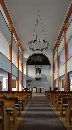 Dominiert wird der helle und schlichte Innenraum von den beidseitig verlaufenden Doppelemporen, die mit gelben Kapitellen geschmückt sind und von blasrosafarbenen Rundsäulen getragen werden. Der neue Altar des Künstlers G. Mall ersetzte in den 1970er Jahren den alten von Jodok Friedrich Wilhelm. Von Wilhelm stammt die über dem Altar an der Rückwand angebrachte Kanzel.[8] Das Himmelfahrtsbild über der Kanzel fertigte Benedikt Heckel an.