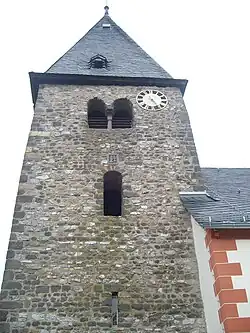 Die Kirche wurde auf einer leichten Erhebung errichtet. Der ungegliederte dreigeschossige, romanische Westturm aus Bruchstein-Mauerwerk mit Lungstein-Eckquadern auf quadratischem Grundriss von 6,7 Meter × 6,7 Meter ist unverputzt und weitgehend erhalten. Die Mauerstärke beträgt 1,9 Meter.[12] Im ersten Geschoss sind schmale Fensterschlitze und im zweiten Geschoss kleine Rundbogenfenster angebracht. Die nach drei Seiten gekuppelten, rundbogigen Fenster im dritten Geschoss weisen auf den romanischen Ursprung und dienten bis ins 20. Jahrhundert als Schallarkaden für das Geläut. Der Glockenturm wird von einem verschieferten Pyramidenhelm abgeschlossen, dessen Form noch aus romanischer Zeit stammt und der von einem Turmknopf, Kreuz und Wetterhahn bekrönt wird. Den Zugang zum Turm gewährt ein rundbogiges Portal an der Südseite. Im Mauerwerk des Turms sind drei Steinbildnisse unbekannter Herkunft aus Basalt eingelassen. An der Westseite ist ein Christuskopf mit Heiligenschein eingemauert, an der Südseite zwei stehende Figuren eines Mannes und einer Frau (das Stifterehepaar?) und über dem Südportal des Turms ist ein stark verwittertes Relief mit Darstellung eines Kopfes. Die Datierung der schwer zu deutenden Bildwerke reicht von frühromanischer bis in die gotische Zeit.[13]