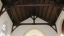 Zur Wölbung des Chores und des Vorder- und Seiteneingangs wurde Bimsstein verwendet. Das Kirchenschiff und die Sakristei sind mit Holzdecken gedeckt. Der Fußboden bestand zur Zeit der Erbauung aus zwei Zentimeter dicken getränkten Buchendielen, der übrige Kirchenraum war mit Tonplatten belegt.[16] Im Zuge der Renovierung 1965/1966 wurden diese durch einen Steinbelag aus schwarzem Anröchter Stein ersetzt.[11] Die Wendeltreppe bis zur Seitenempore besteht aus härtestem Sandstein, von dort ab ist die Turmtreppe aus Holz gefertigt. Die beweglichen Kirchenbänke boten Platz für etwa 146 Besucher.[15] Weitere 20 Plätze können durch eine Zusatzbestuhlung geschaffen werden. An der Westseite der Kirche befindet sich die im Rahmen der Renovierung 1996 eingezogene Orgelempore. Die ursprüngliche Orgelempore befindet sich im ersten Stock des Turms über der Sakristei.