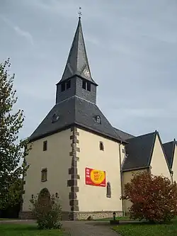 Die dreischiffige Hallenkirche am westlichen Ortsrand ist aus Bruchsteinmauerwerk aus Basalt errichtet. Sie ist an den alten Westturm angebaut und um zwei Ostchöre erweitert. Die Gliederungen des Gebäudes bestehen aus Lungstein. Der umlaufende abgeschrägte Sockel bezieht nicht das nördliche Seitenschiff ein. Teils erhalten ist die wehrhafte Mauerumfriedung, die an der Nordseite zwei Schießscharten aufweist.[2] Der Kirchhof wurde bis 1831 für Bestattungen genutzt.[13]