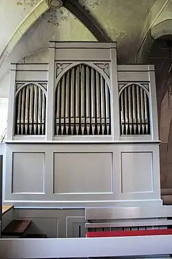 Im Jahr 1691/92 schaffte die Gemeinde eine neue Orgel an. Aus dieser Zeit sind der Orgelaufgang und die Bühne erhalten.[18] Reparaturen erfolgten 1784, 1872, 1878 und 1891. Die Licher Orgelbaufirma Förster & Nicolaus baute im Jahr 1901 die heutige kleine Orgel als eine ihrer ersten Werke. Abgesehen von einer kleinen Änderung der Disposition ist der ursprüngliche Zustand weitgehend erhalten einschließlich des originalen Prospektpfeifen. Die Zinnpfeifen mussten im Zweiten Weltkrieg nicht abgeliefert werden. Das Instrument verfügt über sechs Register auf einem Manual und Pedal und pneumatische Kegelladen. Im Jahr 1990 erfolgte eine Renovierung und 2013 eine gründliche Sanierung. Die Disposition lautet wie folgt:[33]