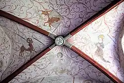Die niedrigen Gewölbe im Langhaus sind mit Rankenwerk des 17. oder 18. Jahrhunderts bemalt.[25] Im südlichen Nebenchor, der „Marienkapelle“, sind Reste von Wandmalereien des 15. Jahrhunderts erhalten. Ursprünglich waren fast die gesamten Wandflächen mit einem Bildprogramm bemalt. Die Ostwand hat eine zinnenbekrönte Sakramentsnische aus Sandstein mit Kielbogen und Blendmaßwerkornamenten. Darüber nimmt Mariä Verkündigung einen prominenten Platz ein. Auf den Wänden verteilt ist ein Zyklus der Vierzehn Nothelfer mit Rankenwerk dargestellt. Rechts der Nische sind die heilige Katharina mit dem Schwert, Margareta als Drachentöterin und Barbara gemalt, links der Nische der heilige Georg mit weiteren Figuren. In der Fensternische werden die heilige Dorothea und Apollonia dargestellt. Die drei Heiligen an der Nordwand sind bisher nicht eindeutig identifiziert.[26] Auf den Gewölbekappen sind die Evangelistensymbole zwischen Rankenwerk zu sehen.[27] Der Schlussstein wird von einem Strahlenkranz umgeben und ist mit einem Zweig mit vier Blättern belegt. Nach Ansicht des Restaurators Bernd Beierlein werden dadurch der Lebensbaum und die vier Paradiesströme symbolisiert.[28]
