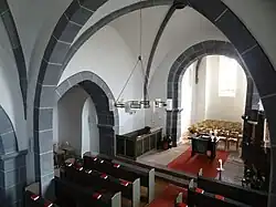 Das nördliche Seitenschiff findet unter einem Schleppdach seinen Platz. Ursprünglich hatte das Seitenschiff ein flacheres Pultdach mit drei kleinen rechteckigen Fenstern, die zwischen dem Pultdach und der Traufe des Hauptdaches angebracht waren. Für diese Fenster diente das Hauptgesims als Sturz. Der Verlauf des früheren Pultdaches ist noch erkennbar.[5] Das Langschiff wird von einem zweijochigen Kreuzrippengewölbe, das Seitenschiff von einer Flachdecke abgeschlossen. Beide Schiffe werden durch zwei große Bögen, die leicht spitzbogig zulaufen, miteinander verbunden. Der Mittelpfeiler weist einen umlaufenden Sockel und umlaufenden Kämpfer auf. Entsprechende Profile haben auch die beiden Endpfeiler und der große rundbogige Triumphbogen. Die in spätgotischer Zeit vergrößerten Fenster mit Spitzbogen an der Südseite belichten das Schiff. Nicht erhalten ist das ursprüngliche Maßwerk.[8] An der Nordseite ist ein rechteckiges Fenster aus späterer Zeit angebracht.