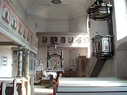 Die Kanzel besteht aus dem Kanzelaufgang, dem polygonalen Kanzelkorb mit gemalten Darstellungen der vier Evangelisten in den Feldern zwischen den gewundenen Ecksäulen und dem reich profilierten Schalldeckel, an dem eine vergoldete Taube hängt. Er wird von flachgeschnitzten weißen Aufsätzen und Spitzen verziert sowie von einem teils vergoldeten Pelikan bekrönt, der seine drei Jungen mit seinem Blut füttert. Die Kanzelfelder zeigen die vier Evangelisten mit ihren Symbolen und die Rückwand die Berufung des Propheten Jesaja (Jes 6,1 ). An Korb und Deckel hängen goldene Glöckchen. Der barocke Taufstein mit einer silbernen Taufschale ist mit der Jahreszahl 1729 bezeichnet und ruht auf einer mit Steinmetzarbeiten verzierten Steinsäule.[1]