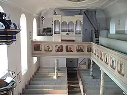 Die einheitlich gestaltete Innenausstattung datiert weitgehend aus der Erbauungszeit der Kirche.[12] Die Emporen im Norden und Westen ruhen auf toskanischen Säulen. Die Brüstungsmalereien stellen die Apostel mit ihren Symbolen dar, die vor der Südwand durch Paulus und Martin Luther ergänzt werden. Die höher eingebaute Ostempore zeigt sechs neutestamentliche Szenen. Sie ruht auf zwei gestuften, schwarzen Säulen mit vergoldeten Kapitellen. Über einem Rundbogen ist ein Kruzifix angebracht. Davor steht die blockförmige Altarmensa.