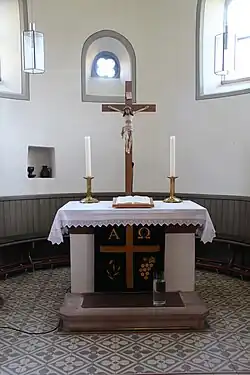 Die eingezogene Apsis ist niedriger als das Langhaus und wird von einem verschieferten Walmdach bedeckt. Der Altarraum wird durch vier Spitzbogenfenster mit Dreipassbogen belichtet. Im Scheitel der Apsis ist ein kleiner Vierpass in hellem Sandstein eingelassen.[3]