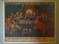 Die alte Winkelempore im Nordwesten ruht auf marmorierten Holzsäulen mit quaderförmigen Kapitellen und geschwungenen Bügen, deren Kanten vergoldet sind. Die Nummerierung auf den Buchbrettern der Empore weist darauf, dass in früherer Zeit die Sitzplätze an die Gemeindeglieder verkauft wurden. Die Empore hat im Westen sechs und im Norden zehn Füllungen, in denen ein Bilderzyklus des Malers Daniel Hisgen aus Lich angebracht ist. Die Ölgemälde auf Leinwand wurden 1785/1786 geschaffen.[17] Dargestellt wird auf 14 Bildern im Hochformat die Geschichte Jesu von der Verkündigung an Maria bis zur Grablegung. Darunter nimmt mit 10 Bildern die Leidensgeschichte Jesu den größten Raum ein. Ein weiteres Bild zeigt den Evangelisten Matthäus. Das letzte Bild mit der Abendmahlsszene im breiteren Querformat ist mit dem Namen des Künstlers signiert.[12] Die Südempore von 1977 trägt keine Ölgemälde. An der alten Ostempore waren bis ins 19. Jahrhundert hinein vermutlich die drei fehlenden Evangelisten angebracht.[11]