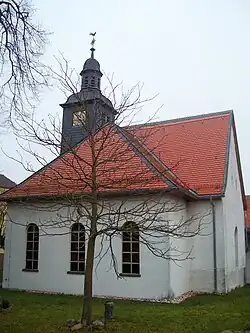 Der geostete Kirchenbau im alten Ortskern ist aus Bruchsteinmauerwerk inmitten eines ummauerten Friedhofs errichtet. Trotz der späteren Umbauten sind die mittelalterlichen Proportionen erhalten. Die Saalkirche wird durch Fenster in drei Achsen gegliedert. Durch die Süderweiterung bildet der Grundriss ein gedrungenes Rechteck (11 × 7,75 Meter). Zudem sprechen die mächtige Wandstärke (etwa 1 Meter dick) und das steile Satteldach, dessen Aufbau die Höhe des Mauerwerks übertrifft, sowie der doppelte Kehlbalkendachstuhl für eine mittelalterliche Entstehungszeit.[14] Ein offener, zweigeschossiger, hölzerner Vorbau an der Westseite ruht auf oktogonalen Holzpfosten und ist ganz geschiefert.