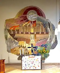 Das Keramikbild hinter dem Altar mit Arche Noah und Taube schufen Heinz und Lies Ebinger aus Bad Ems im Jahr 1983.