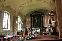 Die Altarwand mit großer Ädikula über Doppelstützen zeigt im Mittelbild den Gekreuzigten und wird von einer Skulptur des Lamm Gottes bekrönt. Wie der Altar sind auch die Kanzel und das Taufbecken im spätklassizistischen Stil gefertigt.