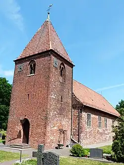 1743 wurde die Saalkirche in der Epoche des Barocks für die dortige reformierte Gemeinde gebaut. Das langgestreckte Kirchenschiff aus rotem Backstein unter einem hohen Satteldach ist aus dem Umbau der alten Kirche hervorgegangen. Sechs hochstehende Rechteckfenster gliedern die Seitenwände, zwei Fenster die gerade Ostwand. Im westlichen Teil haben vom Boden bis zu den Sohlbänken der Fenster die Backsteine das gleiche Format und den gleichen Verwitterungsgrad wie am Turm und bilden einen gleichartigen mittelalterlichen Mauerverband, sodass das Mauerwerk hier etwa ebenso alt wie der Turm sein dürfte. Im östlichen Teil sind die Backsteinformate ebenfalls mittelalterlich, weichen aber etwas von dem des Turms ab, und der Mauerwerksverband mit Lagen ganz aus Bindern ist typisch neuzeitlich. Anscheinend hat man hier neue Wände aus dem Material des Vorgängerbaus errichtet.