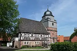 Der älteste Teil der Kirche ist der Chorturm. Hier befindet sich die Jahreszahl 1577, die vermuten lässt, dass in diesem Jahr der Turm fertiggestellt wurde. Ihm wurden 1913 die mit Schiefern verkleidete Glockenstube und die Haube aufgesetzt. Das Kirchenschiff ist im Jahr 1697 angefügt worden und als es baufällig war, wurde es von 1913 bis 1914 umgebaut und erhielt ein Obergeschoss mit einem aufwendig gestalteten Fachwerkgefüge, das den Einfluss der thüringischen Fachwerkarchitektur zeigt, die sich im Ort auch an zahlreichen Häusern findet. Die Fassade wird vor allem von markanten K-Streben und dem Rautengeflecht der Gefache unter den Fenstern geprägt.[2]
