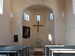 Der schmucklose Saal im Kircheninneren besitzt eine quergelagerte Orgelempore über dem Eingang. Der Chor mit polygonalem Schluss an der nordwestlichen Seite ist über zwei Stufen erreichbar. An der Wand hinter dem Altar hängt ein Bild mit der Darstellung der Kreuzabnahme Jesu des verstorbenen Wellingeröder Dorfmalers Rolf Werner Stuß.[3][4]
