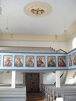 Im Norden und Westen ist eine Winkelempore aus der Erbauungszeit eingebaut, die auf mächtigen viereckigen Pfosten ruht. Die Emporenbrüstung hat Malereien von F. Pauli mit Darstellungen von Jesus, den zwölf Aposteln und den vier Evangelisten. Die Orgelempore zeigt zentral die Kreuzigungsszene, flankiert von Paulus und Luther sowie Mose und Aaron.[10]