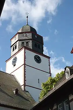 1475 bis 1518 wurde am südwestlichen Stadtrand die dem hl. Laurentius geweihte Kirche errichtet. Sie brannte 1635 zum Teil nieder und wurde 1651 bis 1658 von dem Hanauer Baumeister August Rumpf wiederaufgebaut.