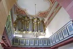 Erste Orgel ist für das Jahr 1614 bezeugt. Sie verfügte über acht Register auf einem Manual. Als Erbauer wird Georg Wagner aus Lich vermutet. Sein Sohn Georg Henrich Wagner errichtete 1664 ein neues Orgelwerk mit derselben Registerzahl, das 1670 umgesetzt und umgebaut wurde. Johann Nikolaus Schäfer aus Hanau ersetzte dieses Instrument 1717/1718 durch eine Orgel mit zehn Register im Manual und vier im Pedal. Der neunachsige Prospekt in weißer Fassung mit vergoldeten Profilen in den Kranzgesimsen und geschnitzten und vergoldeten Blindflügeln und Schleierbrettern ist bis heute erhalten. Gustav Raßmann erweiterte die Orgel 1881 um ein schwellbares Oberwerk auf insgesamt 20 Register. 1971/72 erfolgte durch den Orgelbauer Günter Hardt aus Möttau ein Neubau mit 31 Registern unter Einbeziehung einiger Register der Vorgängerorgel und des barocken Prospektes.[1] Die heutige Orgel verfügt über 31 Register auf zwei Manualen und Pedal. Die Trakturen sind mechanisch ausgeführt. Die Disposition lautet wie folgt:[2]