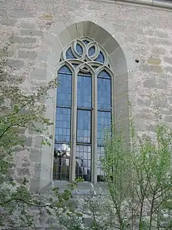 Die Achse der Kirche, etwa der des benachbarten Schlosses parallel, folgt dem Fallen des Hügels und ist nach Nordosten ausgerichtet, mit einer überdachten hölzernen Doppel-Emporentreppe von 1750 an der südwestlichen Bergseite und der Apsis im Erdgeschoss des unten viereckigen, darüber achteckigen Chorturms mit Kuppeldach im Nordosten. Südöstlich an den Turm schließt die Sakristei an, in der auch der Turmaufgang beginnt. Unfern der Apsis steht außen an der Kirchenmauer im Nordwesten ein niedriges Türmchen mit polygonalem Grundriss und Helm, über das früher eine weitere Empore im Vorderteil der Kirche zugänglich war; diese ist heute nicht mehr vorhanden und der Aufgang ist deshalb ebenso funktionslos wie die äußere Emporentreppe, weil inzwischen auch innen eine Treppe den Aufstieg zu dieser erlaubt. Zwei Eingänge liegen achsensymmetrisch gegenüber seitlich vorn am Schiff an der Nordwest- und Südostseite, zwei andere im hinteren Teil auf der Achse des Schiffs übereinander auf Emporenhöhe sowie – außen ebenerdig – darunter. Die Stiftertafel ist über dem Nordwesteingang angebracht.