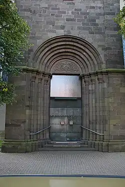 Der Turm auf quadratischem Grundriss im Nordosten ist in das Kirchenschiff eingebunden. Er hat drei gemauerte Geschosse, über denen sich ein achtseitiger Spitzhelm erhebt, der von Turmknopf, Kreuz und Wetterhahn bekrönt wird. Die Gesamthöhe beträgt 53,10 Meter. Ein Umlauf über dem Turmschaft gewährt einen Blick über Stadt und Umland. Das Portal wird an beiden Seiten von einer siebenfach abgestuften Reihe mit drei Dreiviertelsäulen flankiert, auf deren Kapitellen ein vorkragender Architrav ruht. Darüber ist ein siebenfach abgestuftes Tympanon angebracht, das ein von Rankenwerk umgebenes Kreuz zeigt. In der Glockenstube befindet sich in 28 Meter Höhe ein Dreiergeläut mit den Tönen d1, f1 und g1 im Te Deum-Motiv. Die größte der drei Glocken, die alle an gekröpften Jochen hängen, wurde 1602 von Laux Rucker gegossen;[18] die mittlere Glocke goss Dilman Schmid im Jahr 1684 und die kleinste stammt aus dem Jahr 1949 von den Gebr. Rincker.