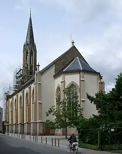 Die Kirche ist eine nach Osten ausgerichtete dreischiffige Hallenkirche mit erhöhten Chor.