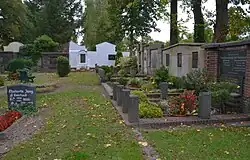 Augenfällig sind beim Friedhof die Erbbegräbnisse ortsansässiger Familien, etwa der Schützes, Hörnickes und Looses. Diese Gräber, die die hohen Außenmauern miteinbeziehen, finden sich bis heute im Nordosten an der Schöneicher Alle sowie im Nordwesten. Die Grabmale zeugen von einstigem Wohlstand. August Kalb schmückte sein Grab mit italienischem Marmor. Das Erbbegräbnis Bothe nimmt einen eigenen kleinen abgeteilten Bereich ein. Künstlerisch herausragend ist das Erbbegräbnis der Familien Schmidt und Sebastian. Der große Grabstein ähnelt dem Eingang zur Friedhofskapelle, in seiner Mitte steht eine Nachbildung des Segnenden Christus von Bertel Thorvaldsen.