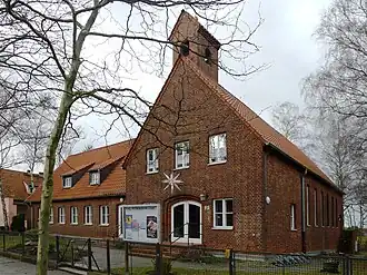 Der T-förmige Gebäudekomplex besteht aus einer Saalkirche und einem rechtwinklig anschließenden Gebäudetrakt, in dem Büro- und Gemeinderäume untergebracht sind. Der eingeschossige Mauerwerksbau ist mit Klinkern verblendet. Der Baukörper mit dem Kirchsaal hat eine eingezogene halbrunde Apsis. Das Portal im Giebel zur Straße hat ein Gewände und ist mit einem Segmentbogen bedeckt.