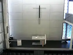 Der schlichte Altar ist aus glattem Beton und freihängend. Er liegt an einer Seite auf dem dunkleren Taufstein auf; das Taufbecken selbst ist in den Altar eingelassen. Die Osterkerze steht auf einem Stein vom See Genezareth.