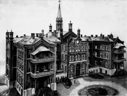 Die Anfänge liegen in einem am 1. Oktober 1849 von evangelischen Bürgern der Stadt Düsseldorf gegründeten Haus an der Berger Straße 18. 1862 erwarb die evangelische Gemeinde in der Friedrichstadt eine sehr geräumige Baustelle für ein neues Krankenhaus.[5] 1866 zog man an den Fürstenwall um. In Sehenswürdigkeiten der Stadt unter öffentlichen Gebäuden wurde das Evangelische Krankenhaus 1877 mit groß und schön angelegt beschrieben. 1878 wurden westlich und nördlich zum Schutz des Krankenhauses Umfassungsmauern gebaut und Ende 1880 ein an der Kronenstraße gelegenes Grundstück durch Schenkung übertragen, sodass die Einfriedung abgeschlossen und mit der Anlage eines Nutzgartens begonnen werden konnte. Das Areal umfasste nun 1 Hektar 54 Are 35 Meter = 6 Morgen 80 Ruthen. 1909 und 1914 kamen Erweiterungsbauten dazu. Zur Modernisierung und Vergrößerung des Hauses wurde 1928 ein Wettbewerb ausgeschrieben. Der Plan des Architekten Fritz Niebel wurde zur Ausführung angenommen.[6] Im Juni 1932 wurde der Erweiterungsbau des Evangelischen Krankenhauses eingeweiht.[7]
