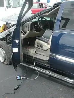 Die Rechtslage in den USA erfordert es, dass EDR-Daten mit einem im Handel erhältlichen ("commercially available") Werkzeug auslesbar sein müssen.[3] Über 87 %[16] der Fahrzeuge des Modelljahrs 2017 und neuer werden durch das CDR-Tool (Crash Data Retrieval) von Bosch unterstützt, das den Abruf von EDR-Daten von einem in einen Unfall verwickelten Fahrzeug ermöglicht. Dieses Tool besteht aus Hardware und Software, die die Möglichkeit bietet, die in den Steuergeräten von Personenkraftwagen, leichten Nutzfahrzeugen und SUVs gespeicherten EDR-Daten, „abzubilden“, „herunterzuladen“ oder „abzurufen“. Die Softwarekomponente ist ein einzelnes eigenständiges Programm,[17] das für die Ausführung in einer Windows-Umgebung konzipiert wurde. Der Hardware-Teil des Tools besteht aus einer Sammlung von Komponenten, einschließlich Kabeln und Adaptern, die von entsprechend geschulten Personen dazu verwendet werden, Daten von unterstützten Fahrzeugen „abzurufen“.