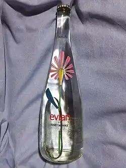 Weitere Designer waren unter anderem Issey Miyake,[18] Paul Smith,[19] André Courrèges[20] und Chiara Ferragni.[21][22] Seit 2018 arbeitet der amerikanische Modedesigner Virgil Abloh als Creative Advisor for Sustainable Innovation Design für Evian[23] und entwarf die Limited Edition 2019.[24][25] Zusätzlich zur Glasflasche hat das Team um Abloh gemeinsam mit dem B Corp-zertifizierten Unternehmen Soma[26] eine wiederbefüllbare Trinkflasche entworfen, die aus bruchsicherem Glas, einer Silikonhülle sowie einem auslaufsicheren Bambusdeckel besteht.[27][28]