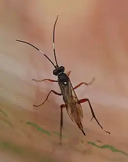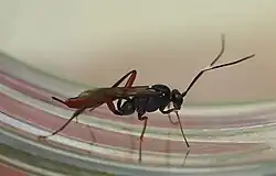 Die Schlupfwespen erreichen eine Körperlänge von 6,5 bis 11 mm.[1] Kopf und Thorax sind schwarz, der Gaster rot. Das Scutellum weist einen blassgelben Fleck auf. Die schwarzen Fühler weisen auf etwa halber Länge ein weißes Band auf. Dieses ist bei den Weibchen breiter als bei den Männchen. Am Hinterleibsende der Weibchen befindet sich ein kurzer Legebohrer (Ovipositor). Die Coxae und Trochanteren sind gewöhnlich schwarz.[1] Die Femora und die vorderen und mittleren Tibien sind rot. Die hinteren Tibien sind schwarz. Das dritte und das vierte hintere Tarsenglied sind weiß gefärbt, ansonsten sind die Hintertarsen schwarz. Die Vorderflügel weisen eine charakteristische Flügeladerung mit einem schmalen dunklen Pterostigma sowie einem annähernd viereckigen Areolet auf.
