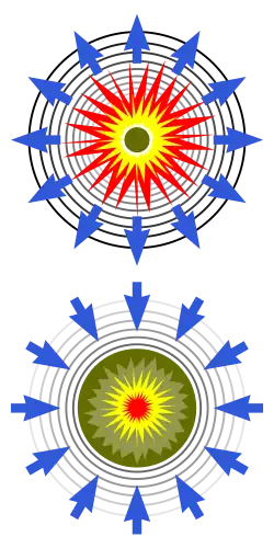 Soweit durch Kräfte in Atomkernen atomare Zerfallsprozesse von sehr schweren Chemischen Elementen, nämlich Uran oder Plutonium, durch eine Kettenreaktion ausgelöst werden, kann es zu einer Kernwaffenexplosion kommen.[8] Eine Explosion kann auch durch das Verschmelzen sehr leichter Kerne in sogenannten Wasserstoffbomben erzielt werden. Sowohl bei der Kernspaltung als auch bei der Kernfusion kommt es zu einem Massenverlust, die Materie wird in Energie (Strahlung und Wärmeenergie) umgewandelt. Hierbei werden die größten Energiemengen von allen von Menschen ausgelösten Explosionen freigesetzt.