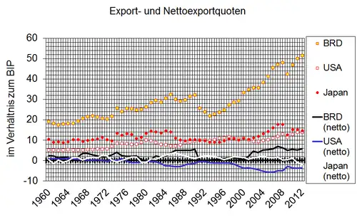 In der Abbildung sind für die Triadenländer, also die drei größten Volkswirtschaften der Welt, die Exporte im Verhältnis zum jeweiligen Bruttoinlandsprodukt (BIP) dargestellt, außerdem der Nettoexport im Verhältnis zum BIP. Steigende Exportquoten deuten auf eine zunehmend arbeitsteilige Weltwirtschaft hin, die Handelsverflechtung der Welt nimmt zu (Globalisierung). Insbesondere in Deutschland wird unter den Schlagworten Exportweltmeister und Basarökonomie eine intensive Debatte um die Bedeutung der deutschen Exportzuwächse geführt.