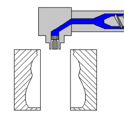 - Das Verarbeitungstemperaturfenster der Rohstoffe muss groß genug sein, damit die Temperatur der Kunststoffmasse besonders bei großen Formteilen über die gesamte Länge des Vorformlings eine Weiterverarbeitung ermöglicht. Je breiter dieses Temperaturfenster ist, desto mehr Zeit steht zur Verfügung, bis die Werkzeughälften geschlossen werden müssen. Eine zu starke Abkühlung kann zu Deformationen während des Aufblasvorgangs und zu einer schlechten Verschweißung der Quetschnaht am unteren Ende des Formlings führen. Die Breite des Verarbeitungstemperaturfensters ist bei Polyolefinen mit etwa 30 Kelvin deutlich höher als bei Polyamiden (PA) oder Polycarbonaten (PC) mit etwa 10, maximal 15 Kelvin.[14]