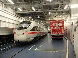 In der Seeschifffahrt werden für den Gütertransport oft sogenannte RoRo-Schiffe eingesetzt, die Güterzüge, Lastkraftwagen oder nur die Trailer derselben auf oder unter Deck transportieren. Ist auch eine Passagiermitnahme vorgesehen, spricht man von einem RoPax-Schiff.