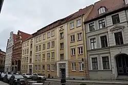Das viergeschossige und zwölfachsige, verputzte Traufenhaus mit seiner schlichten Fassade wurde im Jahr 1952 anstelle von durch den Bombenangriff auf Stralsund am 6. Oktober 1944 zerstörten Gebäuden errichtet.