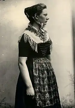 Traditionell trugen die Frauen historisch wie im Rest von Europa Hauben verschiedener Formen. Die üblichste Variante war eine dunkle, zweiteilige Haube, die Schädel, Nacken und den hinteren Teil der Schläfe bedeckte und mit Seidenbändern unter dem Kinn gehalten wurde. Die Bänder waren für Mädchen und junge Frauen rot, für ältere Frauen blau, für Witwen dunkelblau. Als Teil der Volkstracht spielt die Haube heute keine Rolle mehr, außer bei jungen Mädchen.[5]