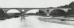 Die von Ferdinand Beutel entworfene erste Föhringer Isarbrücke war eine Bogenbrücke aus Stampfbeton. Sie bestand aus drei Dreigelenkbögen mit lichten Weiten von jeweils 30,46 Metern und einer Breite von 3,94 Metern. Die Gewölbe hatten lichte Höhen zwischen 9,45 und 9,65 Metern bei einer Pfeilhöhe von 7,08 Metern. Durch die flache Ausführung der Bögen erhielt die Brücke eine große und gleichmäßige Durchfahrtshöhe, die einen möglichen Ausbau der Isar für die Großschifffahrt berücksichtigte. Um die Sichtbeschränkung entlang der Isar gering zu halten, waren in den beiden Strompfeilern und den Widerlagern überwölbte Öffnungen vorhanden.[11][12] Auf der Südseite der Pfeiler befanden sich unterhalb der Öffnungen halbrunde Vorköpfe, die mit runden Hauben abgedeckt waren. Während die Hauptbögen eine glatte Oberfläche aufwiesen, waren die Bogenzwickel durch horizontale Nuten gegliedert. Die Brückenplatte kragte leicht über die Gewölbe aus und war mit einem ornamentierten Metallgeländer ausgestattet.[13]