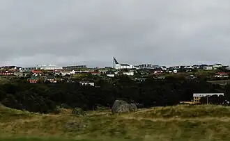 | Blick über Hoyvík und Hoydalar: In der Mitte die Kirche von Hoyvík und rechts die Schule in Hoydalar. | |