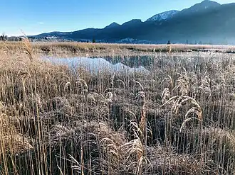Der Fügsee ist ringsum von Schilf umgeben und wird von Druckquellen offen gehalten.[1]