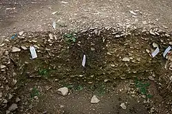 Römischen Ursprungs sind die Überreste eines 18 × 17 Meter großen, beheizbaren und mit Risaliten versehenen Wohngebäudes aus Stein. Ihm werden ein Holzhaus, ein gemauerter Töpferofen und ein Steinbrunnen zugeordnet. Die angrenzenden schmalen, über 50 Meter langen Gräben mit Pfostenstandspuren werden als Zäune oder Hecken zur Einfriedungen von Pferdekoppeln interpretiert. Nicht geklärt ist, ob es sich hier um eine villa rustica handelte oder um eine Außenanlage des wenige hundert Meter entfernten Kastells Heidenheim.[13] Aus dem Töpferofen stammt ein Ziegel mit dem Stempeldruck des dort bis um 155–160 n. Chr.[14] stationierten Reiterregiments Ala Secunda Flavia Pia Fidelis Milliaria.[11] Weitere römische Funde umfassen neben zerscherbter, reliefverzierter Sigillata[2] auch wenige Bruchstücke Gebrauchskeramik, zwei Münzen,[6][7] eine Fibel, das Bruchstück eines Militärdiploms[13] und eine wahrscheinlich aus rotem Jaspis gefertigte Gemme mit Darstellungen der Götter Mars und Victoria.[15][7]