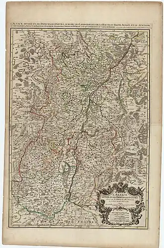 | Territorium der Fürstabtei Murbach (im Südwesten des Elsass = linke untere Hälfte der Karte, schwach orange gerahmt; Karte von Alexis Hubert Jaillot nach Nicolas Sanson d' Abbeville) | |