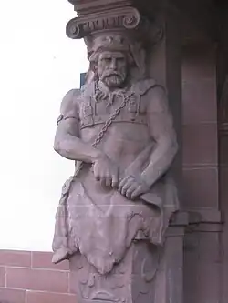 Der Fürstenbahnhof[4] hatte – aus protokollarischen Gründen – an Gleis 1 zu liegen. Das Gleis erhielt eine eigene Bahnsteighalle, die gegenüber den Hallen für den öffentlichen Verkehr versetzt war. Da der Gleiskörper hier in Dammlage verläuft, befindet sich der straßenseitige Zugang im Erdgeschoss, der Zugang zum Bahnsteig auf der Ebene des ersten Obergeschosses. Die Figuren Thusnelda und Arminius, die die straßenseitige Überdachung des Eingangs stützen, stammen von dem Bildhauer Johann Georg Bäumler. Bahnsteigseitig zierte das Gebäude ein Wandgemälde von Carl Nebel: Empfang eines germanischen Fürsten durch den römischen Feldherrn vor der porta decumana der Saalburg. Es wurde beim Abbruch der Bahnsteighallen des Bahnhofs 1961 beseitigt.[5]