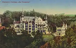 1854 entstand mit dem Sommerhaus des Fleischermeisters Samuel Liebetrau der Ursprungsbau des späteren Hotelkomplexes. Dieses Haus wurde 1861 von dem Geologen und Bergbauunternehmer Johann Georg Bornemann erworben und schrittweise durch Anbauten ergänzt.[2] So entstand die „Villa Bornemann“, die nach dem Tod von Bornemann (1896) verkauft wurde. Nach Umbau und Erweiterung durch die Architekten Georg Unruh und Lorenz Freitag wurde in dem Gebäude am 15. Mai 1902 das „Kurhaus Hotel Fürstenhof“ eröffnet. Der große Festsaal bot zu diesem Zeitpunkt bereits für 1800 Personen Platz und galt als größter Veranstaltungssaal in Thüringen. Die bürgerliche Oberschicht in Eisenach war bestrebt, den Ort nach dem Vorbild von Baden-Baden in eine mondäne Kurstadt zu verwandeln. 1903 wurde an der Waisenstraße den Hang aufnehmend eine Kurhausterrasse mit Garagen im Erdgeschoss und einem weiteren Grottensaal im Zwischengeschoss errichtet. Aus dem Kurhaus entstand nach Aufgabe der Kurstadtpläne durch weitere An- und Umbauten das „Hotel Fürstenhof“, das durch den schrittweisen Ausbau ein eklektizistisches Erscheinungsbild erhielt. Markant waren mehrere Zwiebeltürme auf dem Gebäude, die heute größtenteils nicht mehr erhalten sind. Auf den Grundmauern der Kurhausterrasse wurde in den 1920er Jahren ein Casino errichtet.