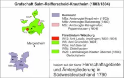 Das Fürstentum Krautheim, auch Fürstentum Salm-Krautheim, bis zur Standeserhöhung des Landesherrn am 7. Januar 1804 Grafschaft Krautheim, war ein weltliches Territorium des Heiligen Römischen Reichs und entstand 1803 auf der Grundlage von § 3 des Reichsdeputationshauptschlusses.[2] Das niedersalmische Haus Salm-Reifferscheidt-Bedburg wurde für den Verlust seiner linksrheinischen Gebiete durch ein aus mainzischen und würzburgischen Besitzungen gebildetes Fürstentum entschädigt. Das Gebiet des neuen Fürstentums umfasste ehemalige Besitzungen von Kloster Schöntal, dem Oberamt Krautheim, dem Priorat Gerlachsheim und dem würzburgischen Oberamt Grünsfeld. Regierender Fürst war Franz Wilhelm zu Salm-Reifferscheidt.