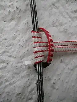 Man knüpft den Prusikknoten wie im Bild gezeigt, mit Einbezug der Doppelung. Dadurch bekommt der Knoten mehr „Körper“, wird folglich griffiger und klemmt weniger stark die Schlinge ein, wo sie aus dem Knoten austritt. Letzteres bewirkt wiederum, dass der Zug der Last direkter das Seil umspannt und so die Klemmwirkung des Knotens verstärkt.