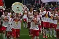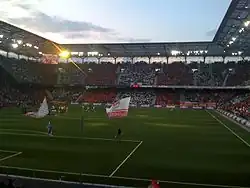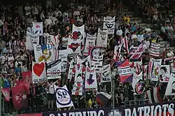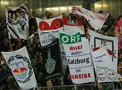 Die Fanszene selbst erholt sich aber nur langsam, da nicht viele der neu hinzugekommenen Zuseher die Fankurve besuchen. Einer der ersten neuen Fanclubs waren die Salzburg Patriots, die zwar weiter an der alten Vereinskultur festhielten, sich aber anfangs mit der neuen Führung arrangierten, bis sie im Dezember 2010 den Status als offizieller Fanklub verloren und sich der Verein von ihnen distanzierte. Als Grund dafür wurden von Seiten des Vereins Sachbeschädigung sowie Attacken auf andere Fanklubs, Ordner und eigene Spieler angegeben. Der Fanclub zerfiel und löste sich schließlich im Herbst 2012 auf. Nachdem sich weitere Fangruppierungen neu bildeten, gab es bis Mai 2013 55 offizielle Fanclubs von Red Bull Salzburg.[82] Die derzeit größten Gruppierungen sind Collectivo, Fire Bulls Voggenberg, Raging Bulls, Alarmstufe Rot Weiss Salzburg, Red Fighters und Soizburg Rabauken. Seit Sommer 2014 existiert auch ein Fanbeirat, der aus insgesamt sieben Vertretern aus Süd-, Ost- und Westtribüne zusammengesetzt ist.[83] Der Fanbeirat wurde jedoch im Rahmen einer Obmännerversammlung im Spätsommer 2016 in Frage gestellt. Daraufhin wurde dieser von den Anwesenden mehrheitlich aufgelöst.