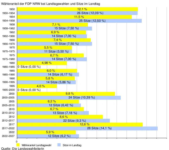 In NRW gilt für die Landtagswahlen die Fünf-Prozent-Hürde. Die FDP scheiterte zweimal an dieser Hürde: Bei der Wahl zum 9. und zum 12. Landtag. Bei der letzten Landtagswahl im Mai 2017 erreichte die FDP ein Plus von 4,0 Prozent und kam auf 12,6 Prozent der Zweitstimmen. In der aktuellen 17. Legislaturperiode gehören dem nordrhein-westfälischen Landtag somit 28 liberale Abgeordnete an.[12]